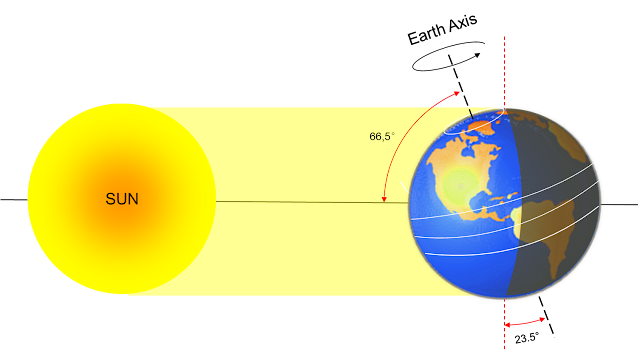 El eje de rotación de la tierra está inclinado en su trayectoria orbital alrededor del sol en un ángulo de aproximadamente 66,5 °, esto es lo que da lugar precisamente a las diferentes estaciones, como se verá más adelante.